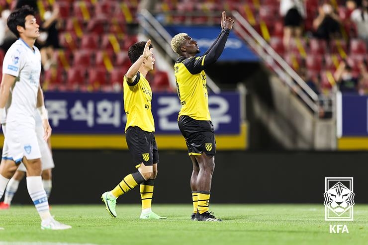 | ▲ In this photo provided by the Korea Football Association, Samuel Nnamani of Jeonnam Dragons (R) celebrates his goal against Pohang Steelers in the quarterfinals of the Korean FA Cup at Gwangyang Football Stadium in Gwangyang, 420 kilometers south of Seoul, on Aug. 11, 2021. (PHOTO NOT FOR SALE) (Yonhap) |