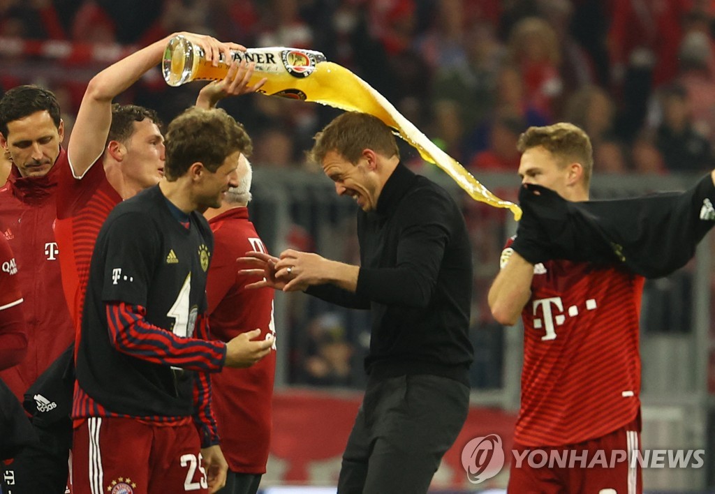 | ▲ 우승 축하하며 맥주 세례받는 뮌헨의 율리안 나겔스만 감독 [로이터=연합뉴스] |