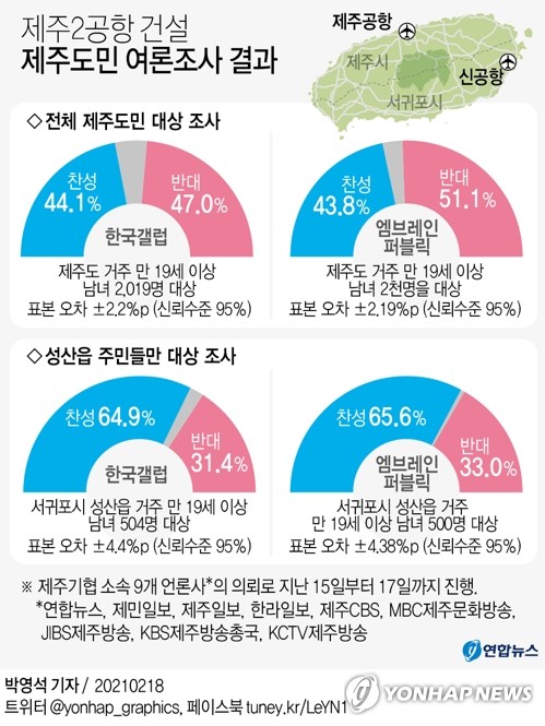 앞서 연합뉴스 등 제주도기자협회 소속 9개 언론사는 지난달 15∼17일 한국갤럽과 엠브레인퍼블릭을 통해 도민 각 2천 명, 성산읍 주민 각 500명을 대상으로 여론조사를 했다.