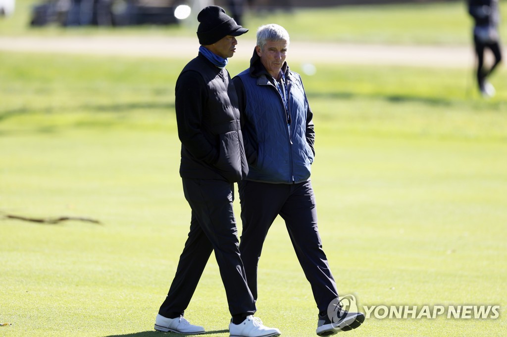 | ▲ Genesis Invitational Golf 프로암 대회에서 함께 걸으며 이야기하는 타이거 우즈(왼쪽)와 제이 모나한 PGA 커미셔너. [AP= 연합뉴스] |