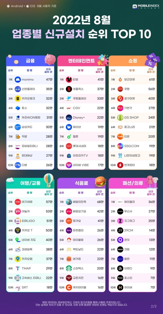 금융 분야에서는 삼성금융네트웍스의 모니모(47만2천251건), 쇼핑 분야에서는 당근마켓(61만794건), 식음료 분야에서는 배달의민족(68만662건), 패션·의류 분야에서는 에이블리(35만7천47건)가 신규설치 순위 1위를 기록했다.