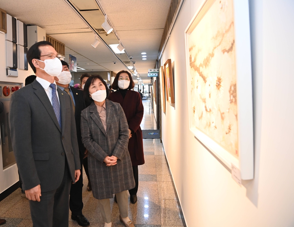 (음성=연합뉴스) 박종국 기자 = 충북 음성군 청사 복도가 미술 작품을 감상할 수 있는 갤러리로 변신했다.