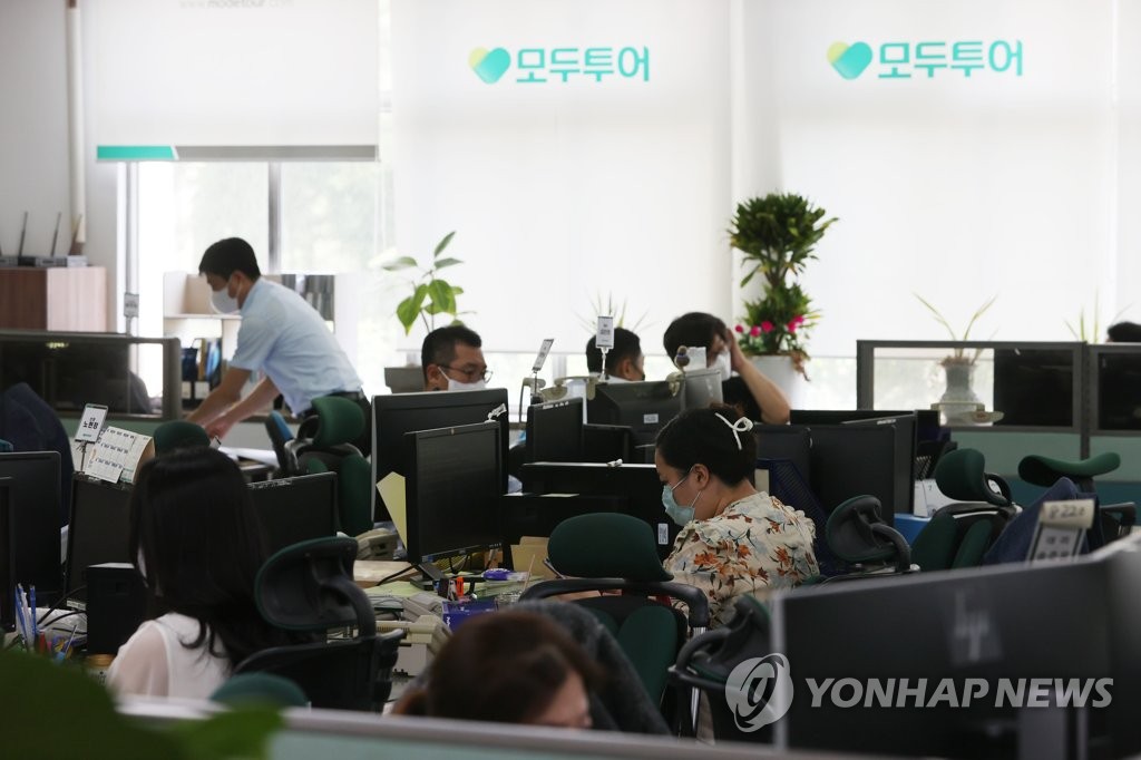 | ▲ Employees work at a Mode Tour office in central Seoul on June 21, 2021, as an accelerating vaccination drive raises hopes of overseas travel to countries such as Guam, Saipan and Taiwan later this year. (Yonhap) |