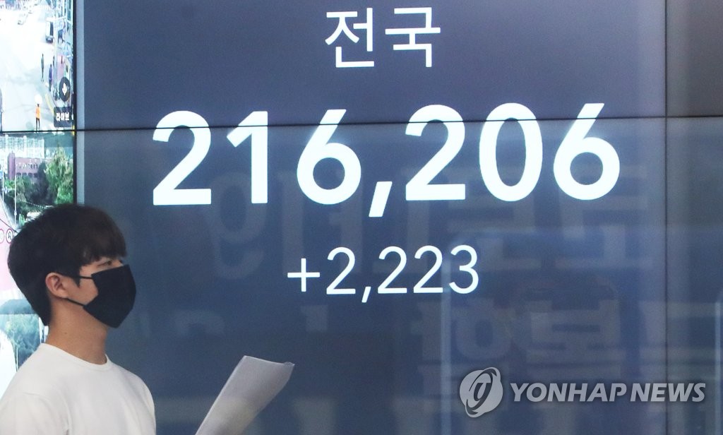 | ▲ 코로나19 신규 확진 2천223명 (성남=연합뉴스) 국내 신종 코로나바이러스 감염증(코로나19) 신규 확진자 수가 2천223명 늘어나며 지난해 1월 20일 국내에서 첫 코로나19 환자가 나온 이후 1년 6개월여 만에 처음으로 2천 명을 넘어섰다 11일 오전 경기도 성남시청 재난안전상황실 모니터에 확진자 숫자가 표시되고 있다. [연합뉴스 자료사진] |