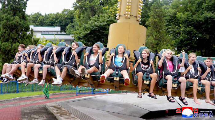 Russian student campers, who are participating in an international children's camp with North Korean students, ride on an attraction at an amusement park in Pyongyang on July 29, 2025, in this photo released by the North's official Korean Central News Agency. (For Use Only in the Republic of Korea. No Redistribution) (Yonhap)