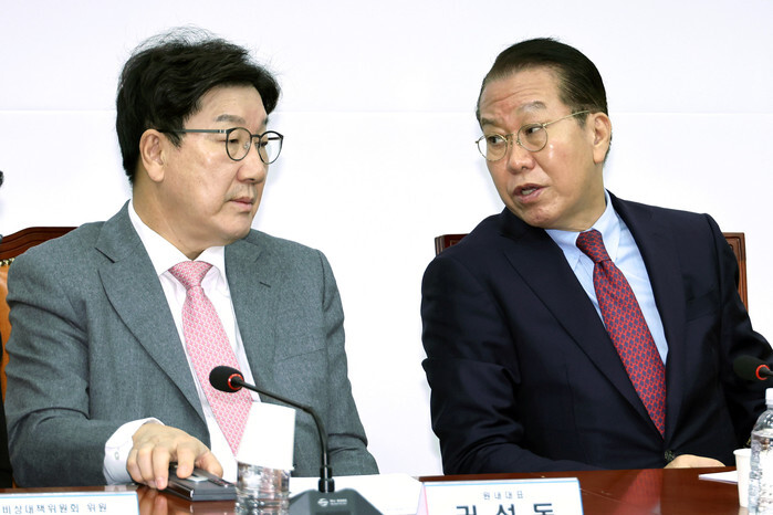 Kwon Young-se (R), chief of the ruling People Power Party's emergency leadership committee, talks with the party's floor leader, Kweon Seong-dong, during a meeting of the committee at the National Assembly in Seoul on Jan. 13, 2025. (Yonhap)