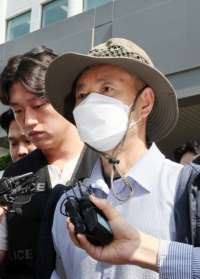 A Chinese national of Korean ethnicity in his 50s, identified as Cha Cheol-nam, leaves a police station in Siheung, just southwest of Seoul, on May 21, 2025, to attend a court hearing to review whether a warrant will be granted for his arrest for allegedly killing two people on May 17 and seriously injuring two others on May 19. (Yonhap)