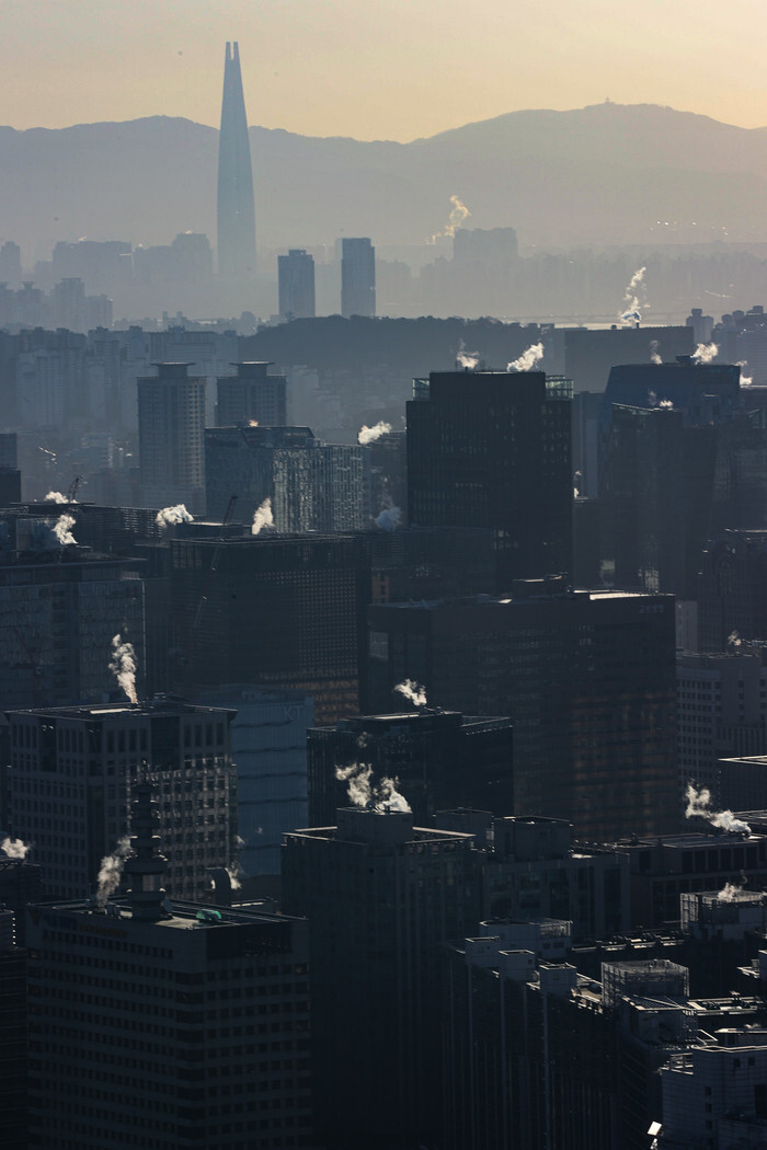 Buildings vent steam generated from heating in downtown Seoul on Nov. 30, 2022, as South Korea experienced cold weather, with the mercury dropping to an intraday low of minus 8 C in the South Korean capital. (Yonhap)