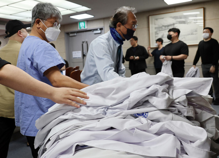 Doctors take off their gowns after submitting their resignations at Wonkwang National University in Iksan, 170 kilometers south of Seoul, on April 29, 2024, protesting the government's unwavering plan to increase the number of medical students by 2,000. (Yonhap)