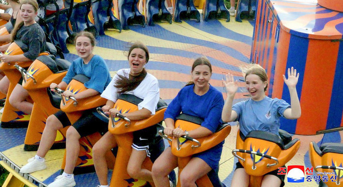 Russian student campers, who are participating in an international children's camp with North Korean students, ride on an attraction at an amusement park in Pyongyang on July 29, 2025, in this photo released by the North's official Korean Central News Agency. (For Use Only in the Republic of Korea. No Redistribution) (Yonhap)