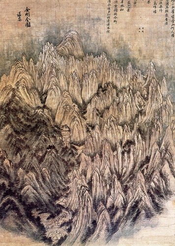 This image, released by the Korea Heritage Service on May 27, 2025, shows "Kumgang jeondo," or "Complete View of Mount Kumgang," painted by Jeong Seon, the great master landscape painter, in 1734 during the late Joseon Dynasty. Mount Kumgang, a scenic mountain on North Korea's east coast that has long been regarded as one of Korea's most scenic mountains for its breathtaking beauty that changes with the seasons, is likely to be listed as a UNESCO World Heritage site following a four-year application process, UNESCO said the same day. (For Use Only in the Republic of Korea. No Redistribution) (Yonhap)