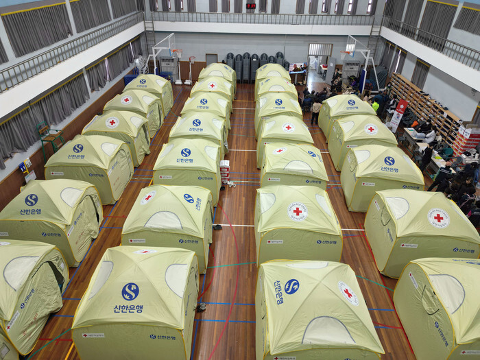 Local government employees and volunteers work for evacuees at a middle school gymnasium used as a shelter in Sancheong, South Gyeongsang Province, southeastern South Korea, on March 24, 2025, following a wildfire on March 21. (Yonhap)