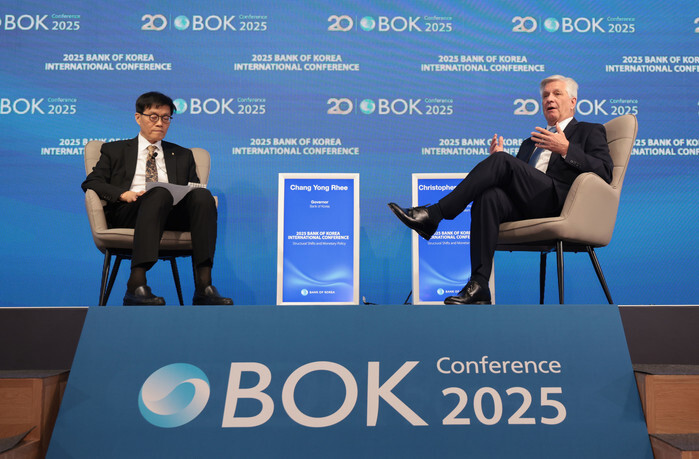 Bank of Korea Gov. Rhee Chang-yong (L) talks with U.S. Federal Reserve Gov. Christopher Waller during an international conference at the central bank in Seoul on June 2, 2025. (Yonhap)