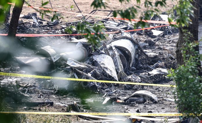 This photo, taken May 30, 2025, shows the wreckage of a Navy patrol plane on a mountain in Pohang, North Gyeongsang Province, southeastern South Korea, following its crash the previous day that killed all four Navy officers aboard the maritime patrol aircraft. (Yonhap)