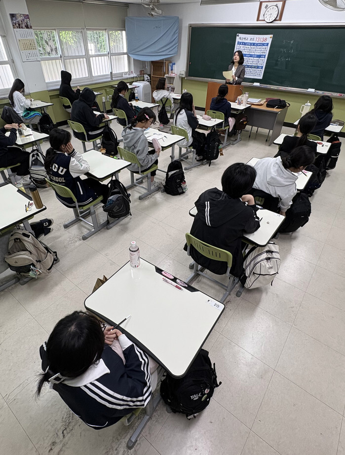 Seniors sit for a nationwide test on their scholastic abilities at a classroom of a high school in the southeastern city of Daegu on May 8, 2025. (Yonhap)