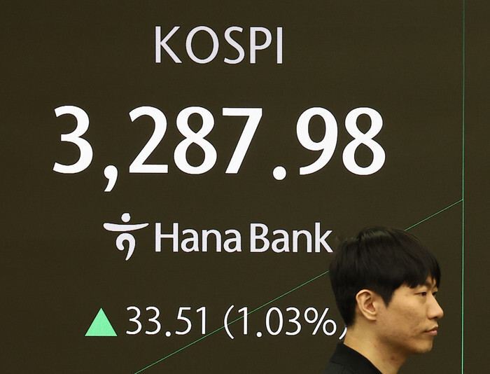 A financial data screen in the dealing room of Hana Bank in Seoul on July 31, 2025, shows the benchmark Korea Composite Stock Price Index logging an intraday high of 3,287.98, up 33.51 points from the previous day, in early trading, following reports of a tariff deal that South Korea reached with the United States. (Yonhap)