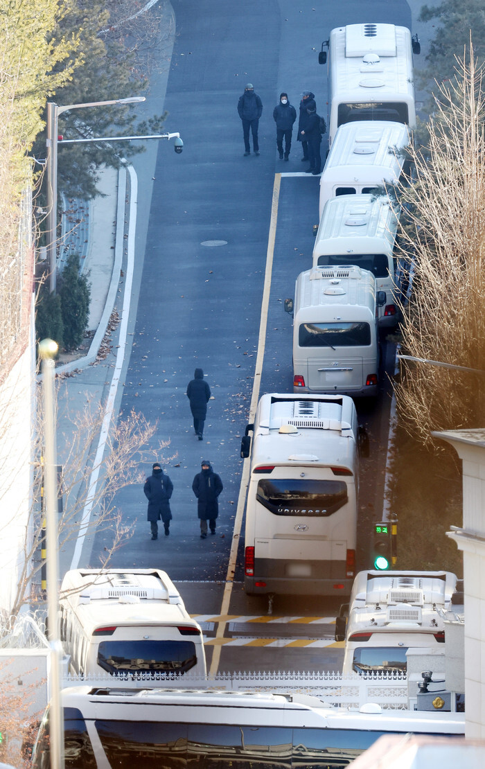 People believed to be security guards shift work near the entrance of impeached President Yoon Suk Yeol's official residence in Seoul on Jan. 9, 2025, as investigators led by the Corruption Investigation Office for High-ranking Officials are expected to execute the second warrant to detain Yoon over his short-lived imposition of martial law. (Yonhap)