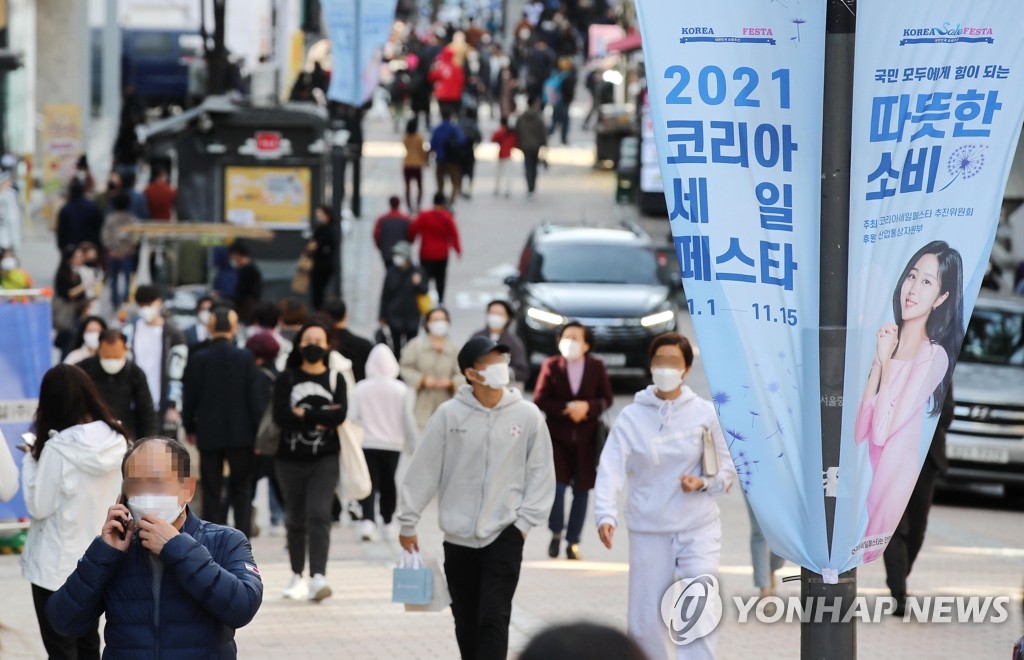 | ▲ This photo, taken Nov. 7, 2021, shows people walking on the street of the shopping district of Myeongdong in Seoul as a state-led sales festival is underway. (Yonhap) |