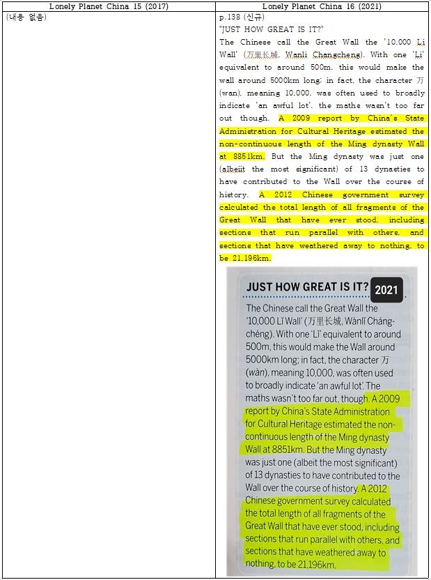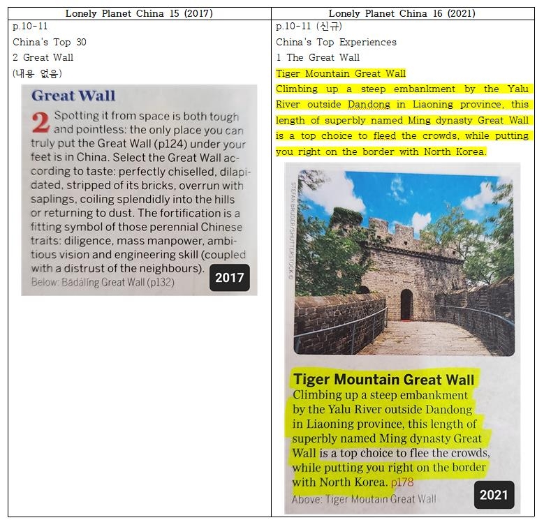 | ▲ '론리 플래닛' 중국 여행 가이드북 15판(왼쪽)과 16판의 내용 차이 15판 10∼11쪽 '중국의 30대 명소'에는 만리장성을 간략히 소개하지만, 16판 10∼11쪽에는 "북한과 접한 압록강변에 있는 명나라 만리장성의 끝 지점으로, (만리장성의 여러 성 중에서) '후산창청'이 최상의 선택"이라는 서술을 추가했다.[반크제공] |