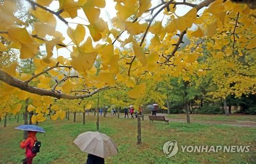 특히 약 5m 간격으로 줄을 맞춰 심어진 은행나무 잎이 노랗게 물들어 장관을 보려는 관광객으로 크게 붐비고 있다.