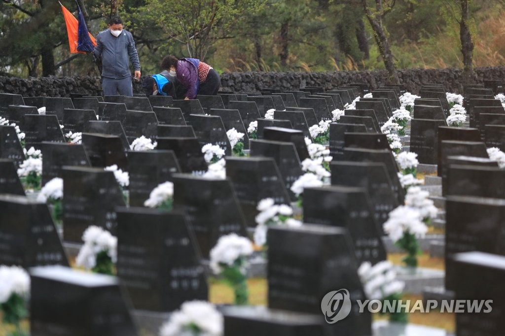 | ▲ '이제 편안히 잠드시길' (제주=연합뉴스) 박지호 기자 = 2021년 4월 3일 오전 제주시 봉개동 4·3평화공원 내 행방불명인 표석을 찾은 유가족들이 희생자의 넋을 위로하고 있다. 2021.4.3 jihopark@yna.co.kr |