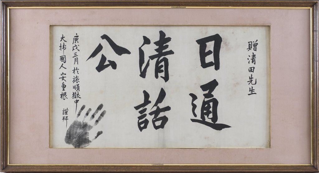이번에 보물이 된 유묵에는 '경술삼월 뤼순감옥에서 대한국인 안중근이 쓰다'를 뜻하는 한문과 손도장이 있다. 유묵 대부분은 일본인에게 주기 위해 제작했다.