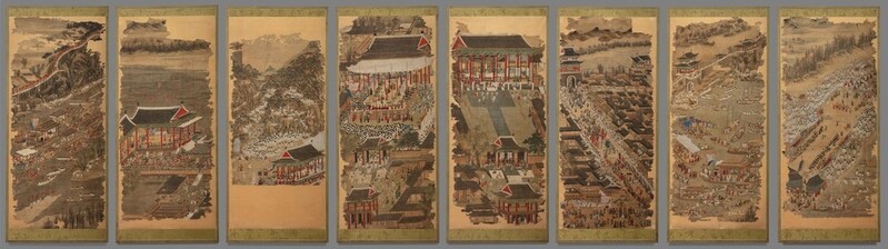 19세기 전반 작품으로 추정되는 평안감사향연도는 평안도에서 열린 도과(道科·조선 시대 각 도의 감사에게 명해 실시한 특수한 과거시험) 급제자들을 위해 평안감사가 베푼 잔치 모습을 비단에 그린 8폭 병풍이다. 현재는 각각 떨어져 낱장으로 분리된 상태다.