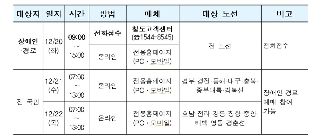 예매 대상은 내년 1월 20∼24일 5일간 운행하는 KTX·ITX-새마을·무궁화호 열차 등이다.