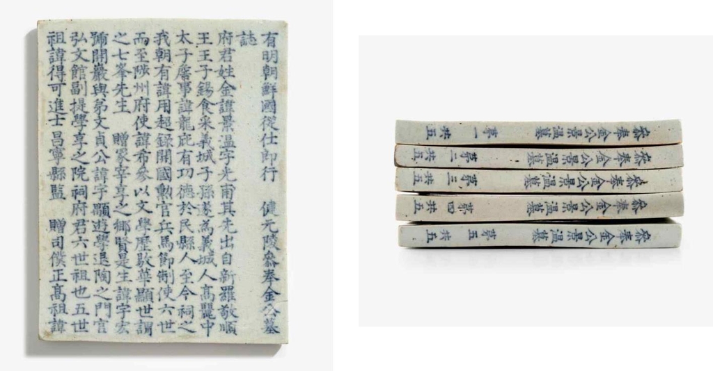 | ▲ '백자청화 김경온 묘지' 첫번째 장과 측면 모습 [문화재청·국외소재문화재재단 제공. 재판매 및 DB 금지] |