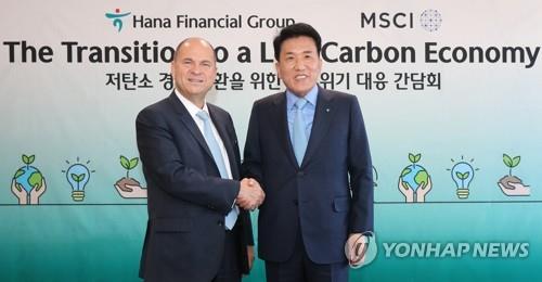 | ▲ Henry A. Fernandez (L), chairman and chief executive of the MSCI, shakes hands with Hana Financial Group chairman Ham Young-joo in Hana's Seoul headquarters on Nov. 4, 2022, in this photo provided by the Hana Financial Group. (PHOTO NOT FOR SALE) (Yonhap) |