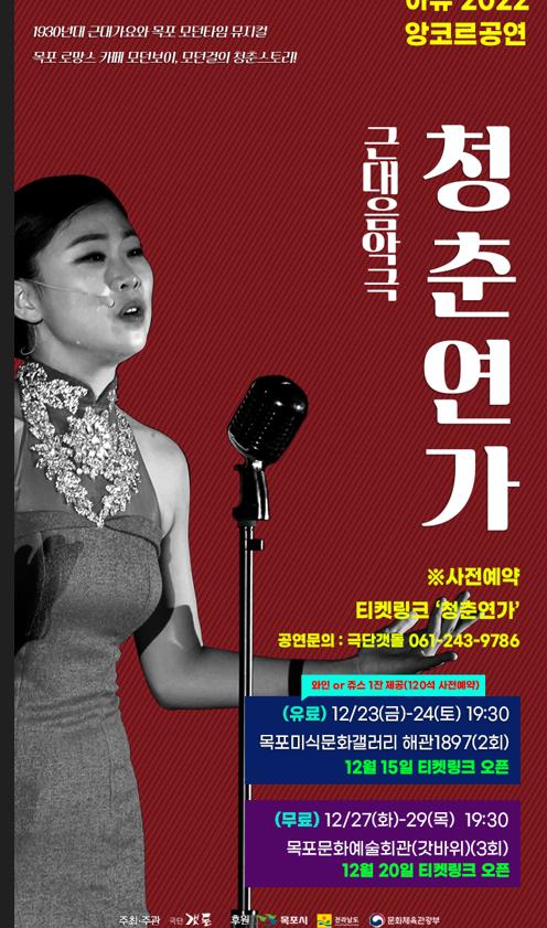 (목포=연합뉴스) 조근영 기자 = 극단 갯돌(전남 목포)이 근대음악극 '청춘연가' 송년 앙코르 공연을 올린다고 22일 밝혔다.
