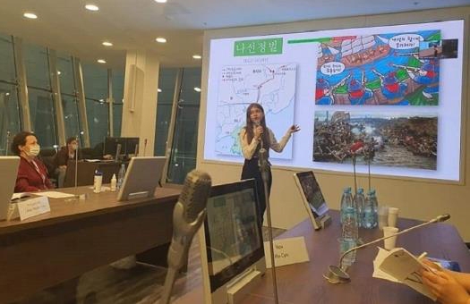 | ▲ 러시아 대학생 한국어 올림피아드 (서울=연합뉴스) 제6회 전 러시아 대학생 한국어 올림피아드에 출전한 한 학생이 '나선정벌'에 대해 설명하고 있다. [한국국제교류재단 제공. 재판매 및 DB 금지] |