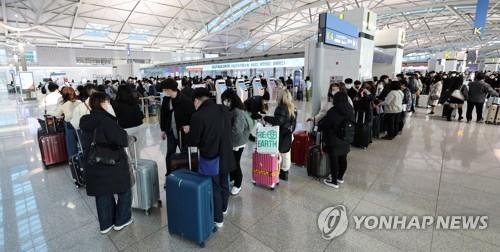 | ▲ This photo, taken Feb. 23, 2023, shows people lining up to leave for Japan at Incheon International Airport, west of Seoul. (Yonhap) |