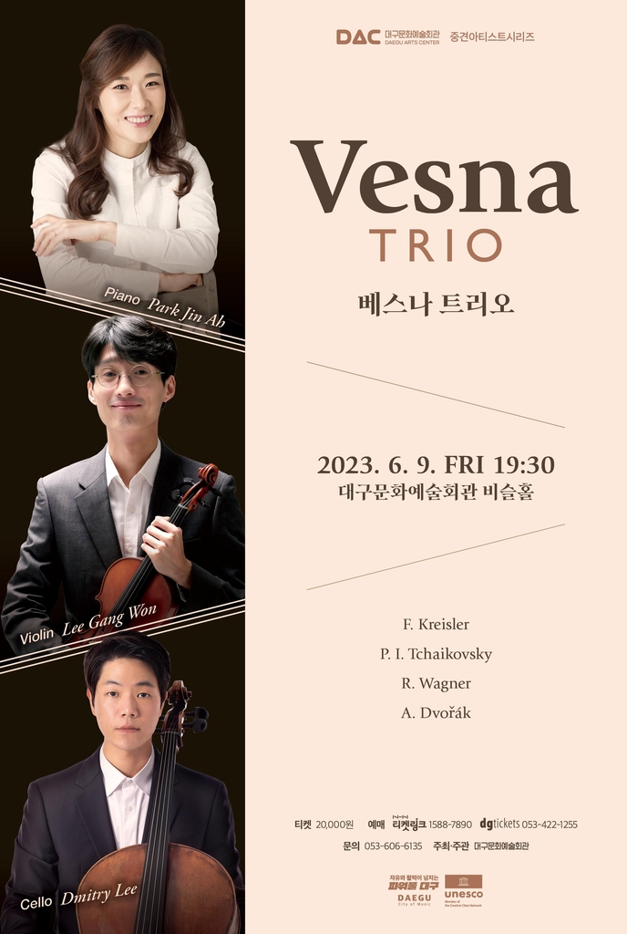 대구문화예술회관 관계자는 7일 "베스나 트리오는 바로크에서 현대에 이르는 폭넓은 레퍼토리를 넘나들며 활발하게 연주 활동을 하는 단체"라며 "이번 공연은 일상의 갈등, 상처 등이 음악을 통해 회복되기를 바라는 마음을 담았다"고 밝혔다.