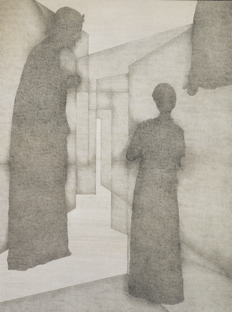 2003년 회화 연작 '유비쿼터스'(Ubiquitous)는 종교 도상인 '수태고지'를 재해석했다. 캔버스에 연필로 선을 무수히 그어 완성한 작품 속 공간은 자세히 보면 벽돌 형상이 쌓여 만들어진 것이다.