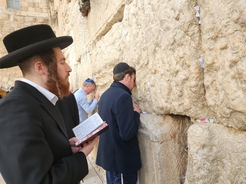 길이 50m, 높이 18m가량의 통곡의 벽 앞에는 오후 늦은 시간에도 많은 사람으로 붐비는 모습이었다. 벽에 이마와 손바닥을 대고서 기도하는 이들 사이로 검은 전통 복장을 한 랍비들이 경전을 암송하듯 말을 되풀이했다.