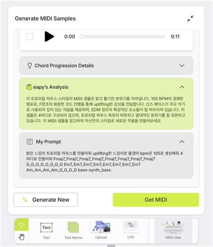 | ▲ 포자랩스 eapy (서울=연합뉴스) 포자랩스 eapy 서비스에서 원하는 곡을 묘사한 후 음원을 생성하자 AI가 생성 결과와 함께 요청 사항을 해석한 결과를 제시했다. 2025.2.14 [포자랩스 제공. 재판매 및 DB 금지] |