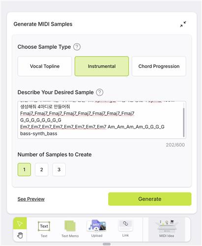 보드에서 '미디 아이디어'를 누르니 보컬 톱라인, 인스트루멘털, 코드 프로그레션 버튼이 나왔다. 보컬 톱라인은 멜로디를, 인스트루멘털은 악기를, 코드 프로그레션은 코드 진행을 의미한다.
