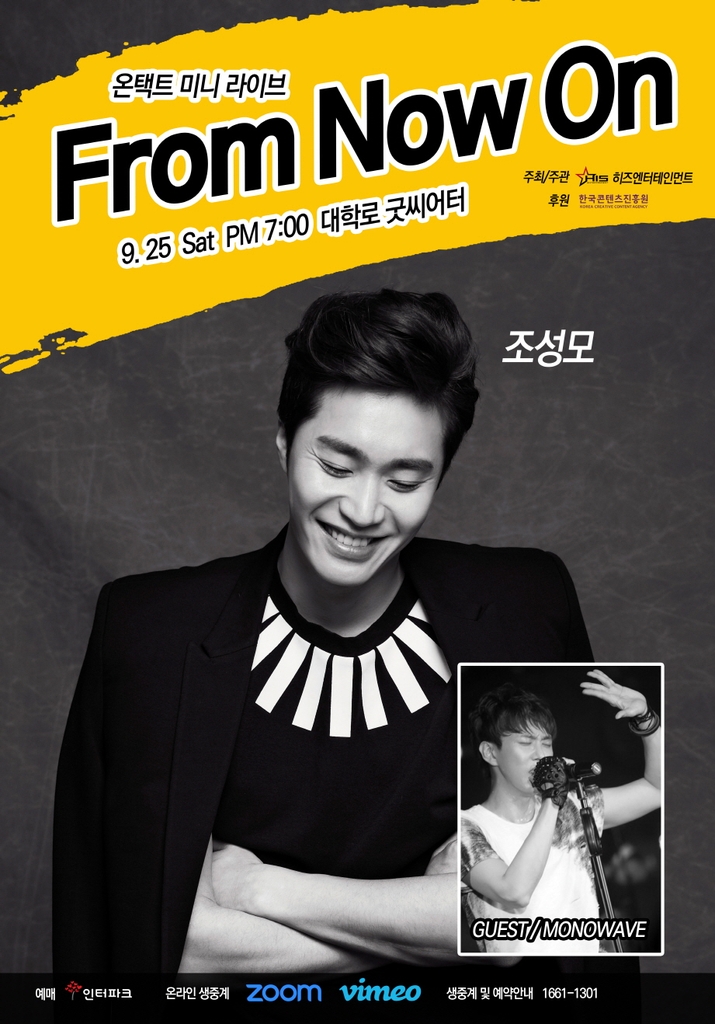 기획사 히즈엔터테인먼트는 김형중, 조성모가 각각 오는 24일과 25일 종로구 굿씨어터에서 온라인 콘서트 '프롬 나우 온'(From now on)을 개최한다고 1일 밝혔다.