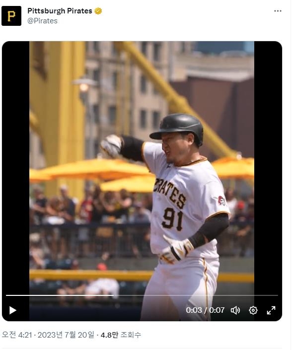 | ▲ 피츠버그 구단이 소개한 최지만의 칼 뽑는 세리머니 장면 [MLB 피츠버그 파이리츠 트위터 계정 캡처. 재판매 및 DB 금지] |