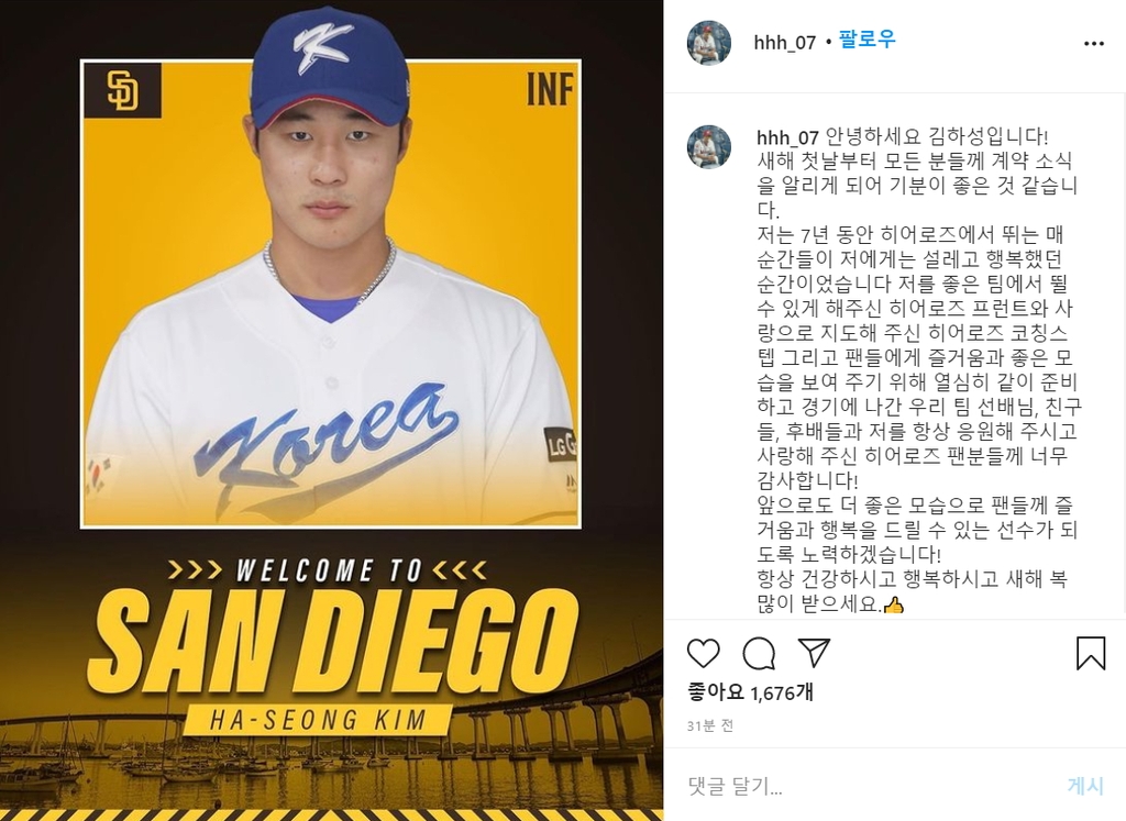 김하성은 1일 자신의 인스타그램에 샌디에이고 파드리스가 자신의 입단을 공식 발표한 사진을 올리면서 "새해 첫날부터 모든 분들께 계약 소식을 알리게 되어 기분이 좋다"고 소감을 밝혔다.
