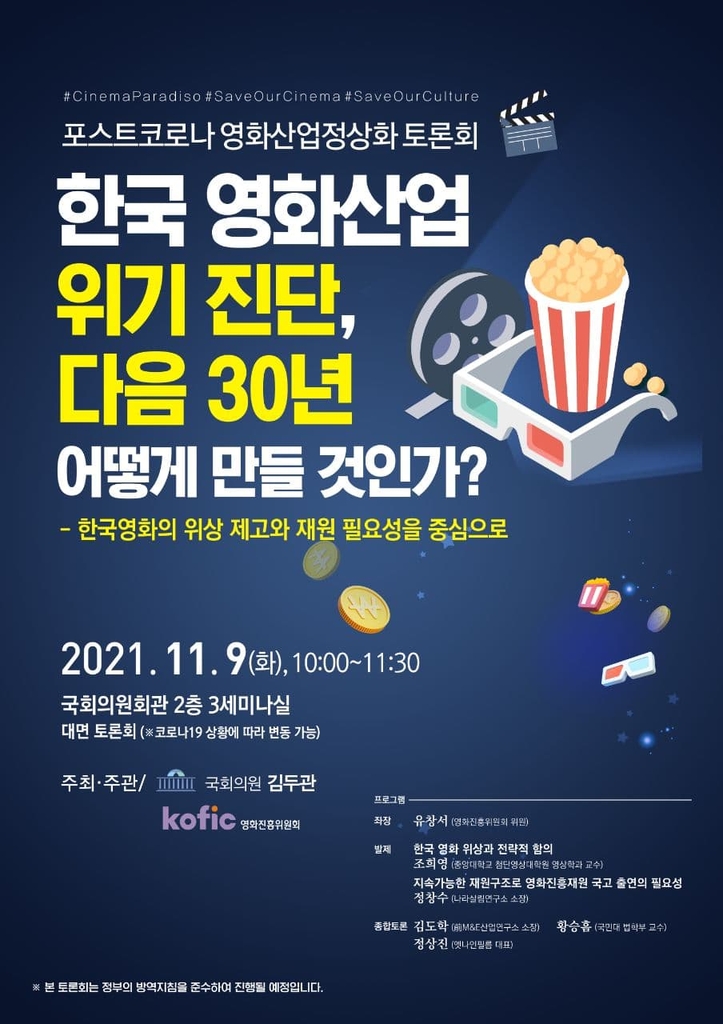 9일 오전 영화진흥위원회(영진위)와 김두관 더불어민주당 의원 주관으로 열린 포스트 코로나 영화산업 정상화 3차 토론회는 '한국영화산업 위기 진단, 다음 30년 어떻게 만들 것인가? - 한국 영화의 위상 제고와 재원 필요성을 중심으로'를 주제로 진행됐다.