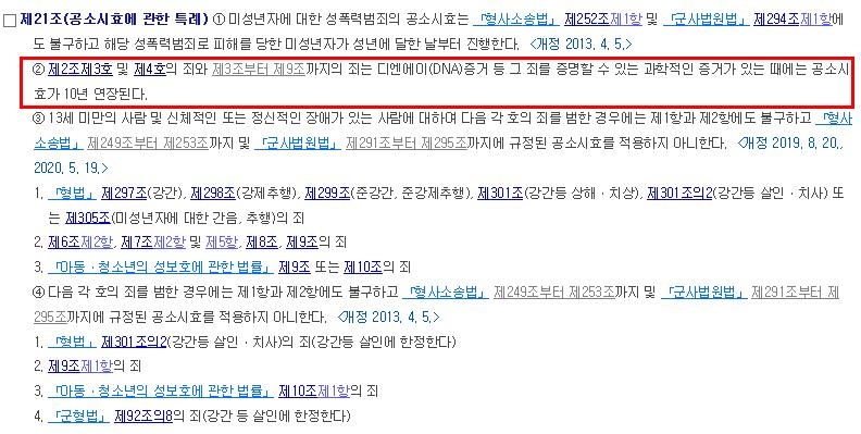 여기에 2010년 4월 제정된 '성폭력범죄의 처벌 등에 관한 특례법'(성폭력처벌법)에 따르면 강간과 강제추행, 강간 상해·치상, 강간 살인·치사 등의 경우 DNA 증거 등 그 죄를 증명할 수 있는 과학적인 증거가 있는 때에는 공소시효가 10년 연장된다.