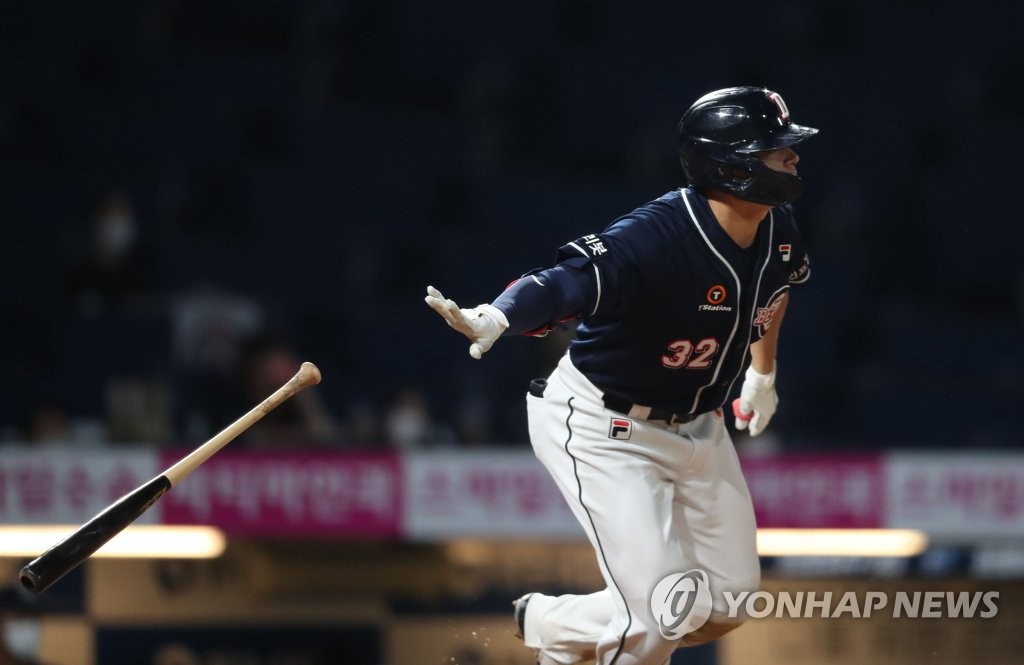 | ▲ Kim Jae-hwan of the Doosan Bears tosses his bat after hitting a single against the NC Dinos in the top of the seventh inning of a Korea Baseball Organization regular season game at Changwon NC Park in Changwon, 400 kilometers southeast of Seoul, on Sept. 10, 2021. (Yonhap) |