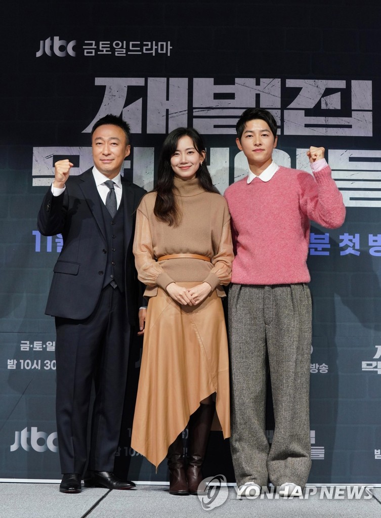 | ▲ Cast members of the JTBC drama series "Reborn Rich" (from L to R), Lee Seong-min, Shin Hyun-been and Song Joong-ki, pose for a photo during a press conference in Seoul on Nov. 17, 2022, in this file photo provided by JTBC. (PHOTO NOT FOR SALE) (Yonhap) |
