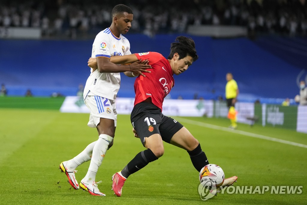 | ▲ In this Associated Press photo, Lee Kang-in of RCD Mallorca (R) and Rodrygo of Real Madrid battle for the ball during their La Liga match at Santiago Bernabeu Stadium in Madrid on Sept. 22, 2021. (Yonhap) |