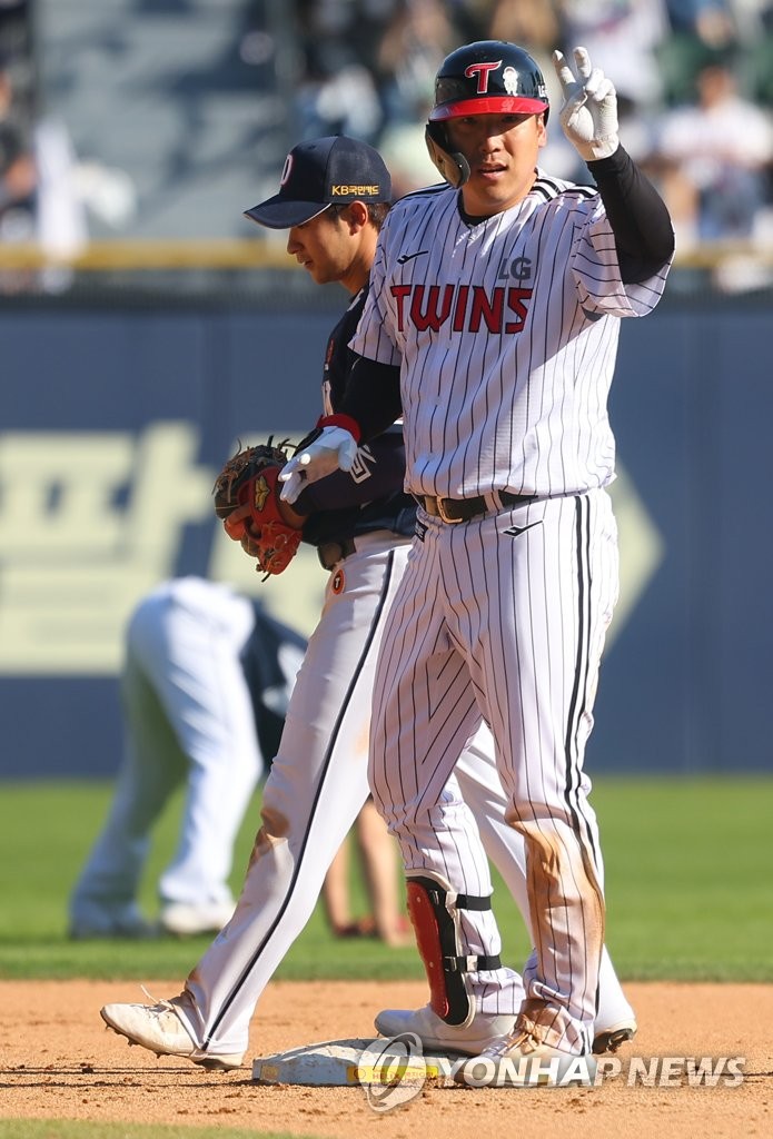 | ▲  In this file photo from May 5, 2022, Kim Hyun-soo of the LG Twins celebrates his double against the Doosan Bears during the bottom of the eighth inning of a Korea Baseball Organization regular season game at Jamsil Baseball Stadium in Seoul. (Yonhap) |