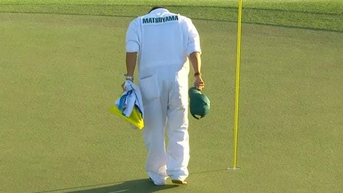 마쓰야마의 캐디인 하야후지 쇼타(일본)는 12일(한국시간) 마스터스 최종 라운드 18번 홀에서 마쓰야마가 챔피언 퍼트를 넣은 뒤 들고 있던 깃대를 홀에 다시 꽂아 넣은 뒤 모자를 벗고 페어웨이를 향해 다리를 모으고 고개를 숙여 공손하게 인사했다.