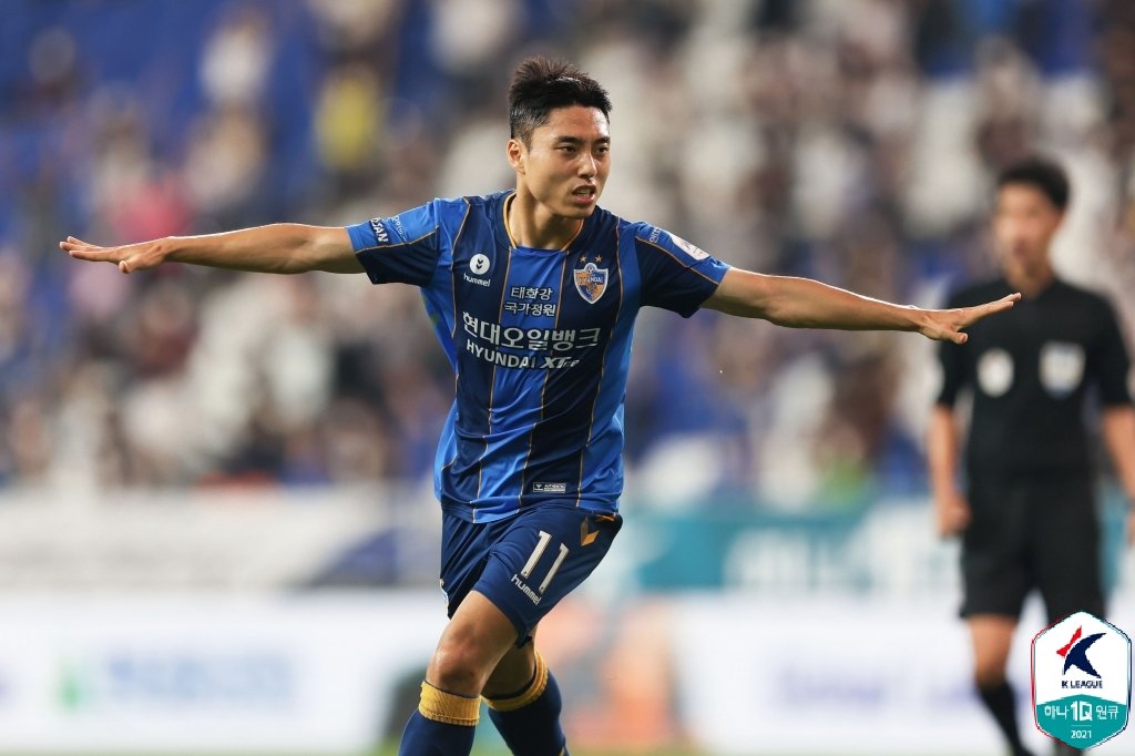 | ▲  In this Aug. 4, 2021, file photo provided by the Korea Professional Football League, Lee Dong-jun of Ulsan Hyundai FC celebrates his goal against Daegu FC during a K League 1 match at Munsu Football Stadium in Ulsan, 415 kilometers southeast of Seoul. (PHOTO NOT FOR SALE) (Yonhap) |
