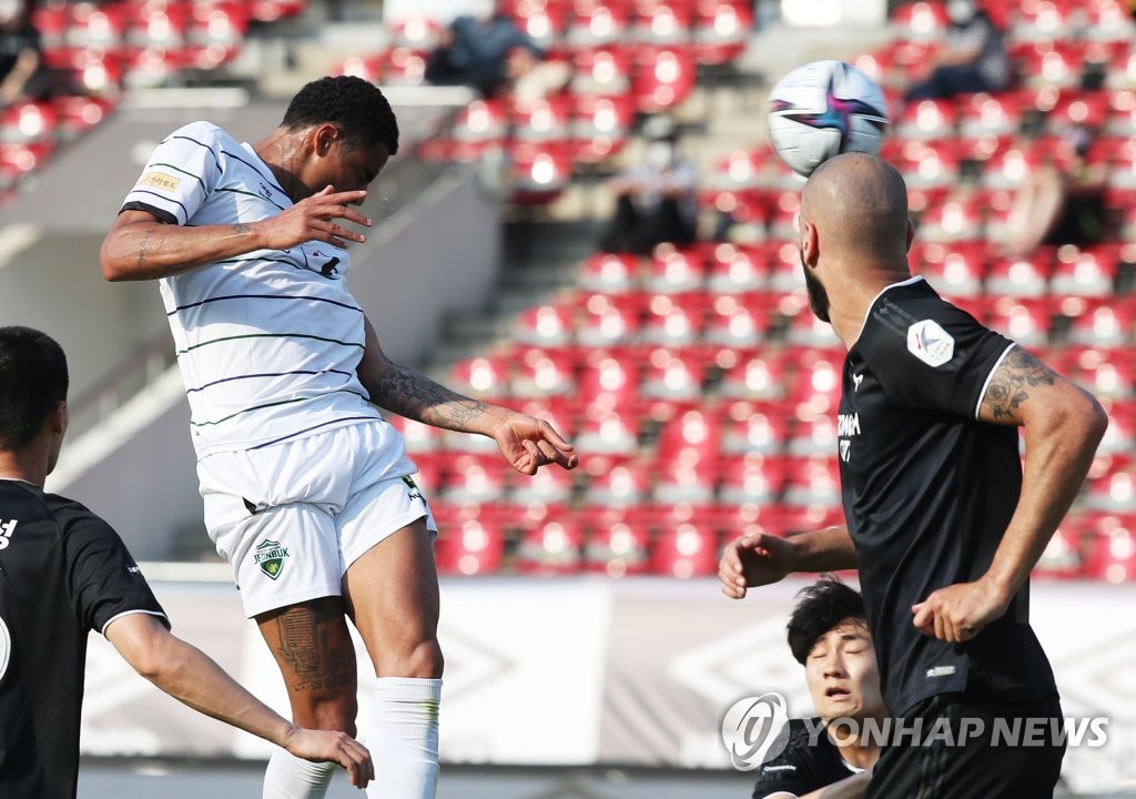 | ▲  In this file photo from June 6, 2021, Gustavo of Jeonbuk Hyundai Motors (L) takes a header against Seongnam FC during a K League 1 match at Tancheon Sports Complex in Seongnam, Gyeonggi Province. (Yonhap) |